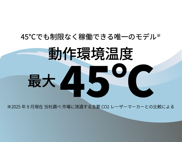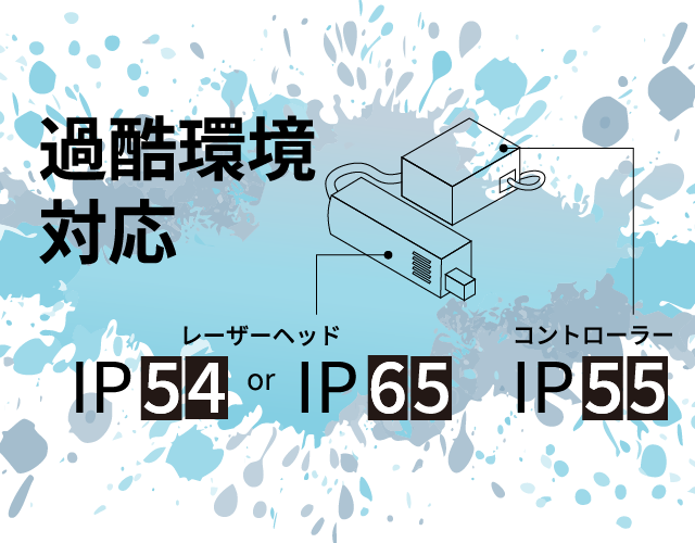 伸縮式で360°回転可能なレーザーヘッドにより、生産ラインに柔軟に組み込むことができます。レーザーヘッドはIP65、コントローラーはIP55 に対応し、45℃の高温環境でも制限なく安定稼働するため、湿気・粉塵が多い現場や夏場の酷暑環境下でも安心してご使用頂けます。